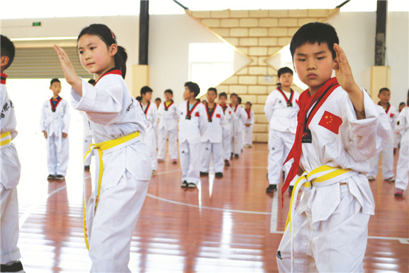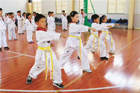 跆拳道社团自2015年开办以来,一直都是深受学校领导的高度重视,除了先后为二、三、四年级同学每周开设一节专业的跆拳道课堂教学外,还在全校开展每周三节的跆拳道特色校本课程,创编跆拳道操,让跆拳道活动艺术化,丰富跆拳道的趣味性,提高同学们的参与热情,保证学习的实际效果。