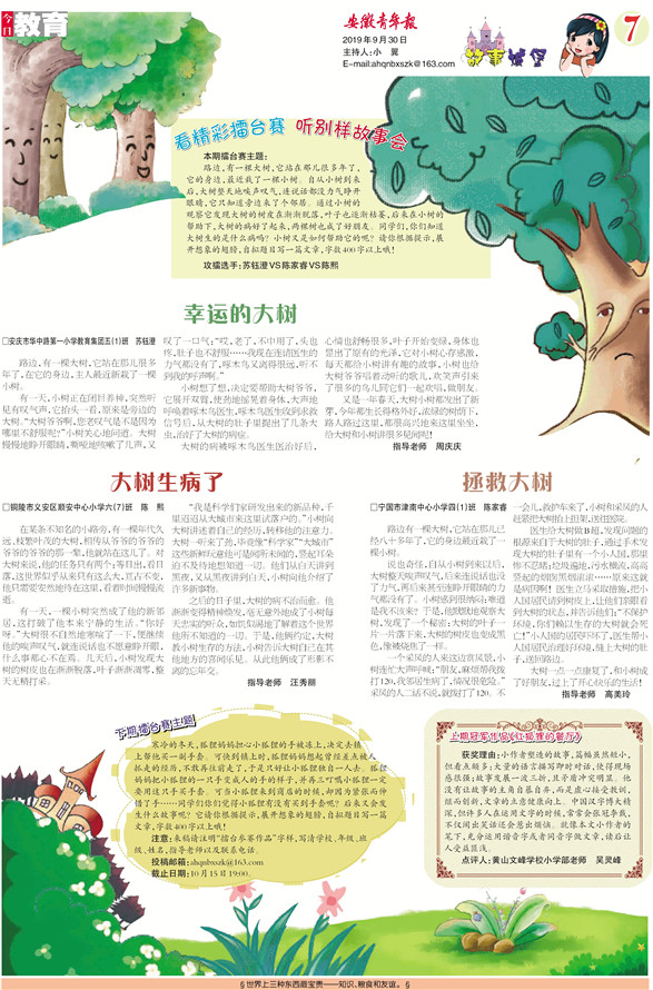 看精彩擂台赛 听别样故事会 本期擂台赛主题: 路边,有一棵大树,它站在那儿很多年了,它的身边,最近栽了一棵小树。自从小树到来后,大树整天地唉声叹气,连说话都没力气睁开眼睛,它只知道旁边来了个邻居。通过小树的观察它发现大树的树皮在渐渐脱落,叶子也逐渐枯萎,后来在小树的帮助下,大树的病好了起来,两棵树也成了好朋友。同学们,你们知道大树生的是什么病吗?小树又是如何帮助它的呢?请你根据提示,展开想象的翅膀,自拟题目写一篇文章,字数400字以上哦! 攻擂选手:苏钰澄VS陈家睿VS陈熙