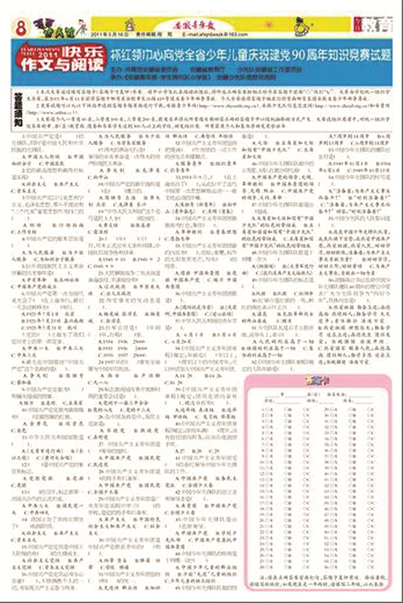 2011年是中国共产党建党90周年,本报联合团省委、省教育厅、省少工委,推出两场“红领巾心向党”主题庆祝活动。其中,安徽省少儿书画大赛得到全省165个教育系统、共青团系统、少工委系统等单位组织初审,共评出获奖作品300幅,优秀组织奖145名;全省少年儿童庆祝建党90周年知识竞赛获40余万人次答题参与。