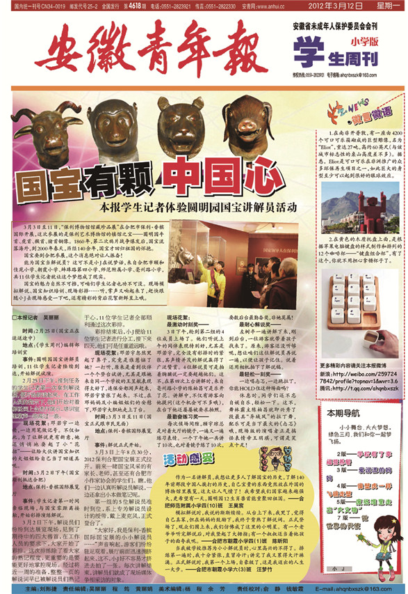 3月3日至11日,圆明园国宝十二生肖牛首、虎首、猴首、猪首等铜像来合肥展出,本报组织11位学生记者,连续两周作为国宝讲解员,为全市市民公益分享国宝知识。