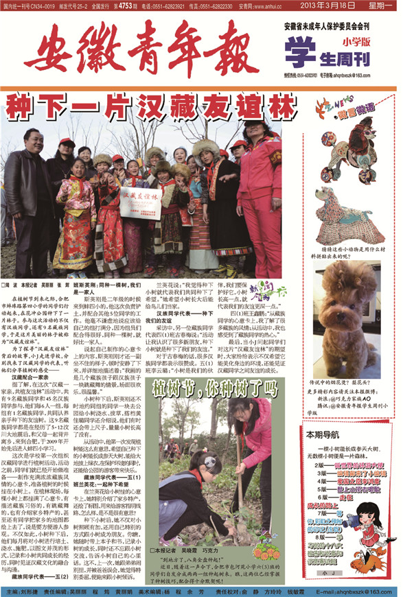 11月18日,9名藏族同学经历了“5·12汶川大地震”后,和父母一起背井离乡,来到合肥学习。在植树节到来之际,他们与合肥市蚌埠路第四小学的同学们行动起来,汉藏一家亲,共植友谊林。