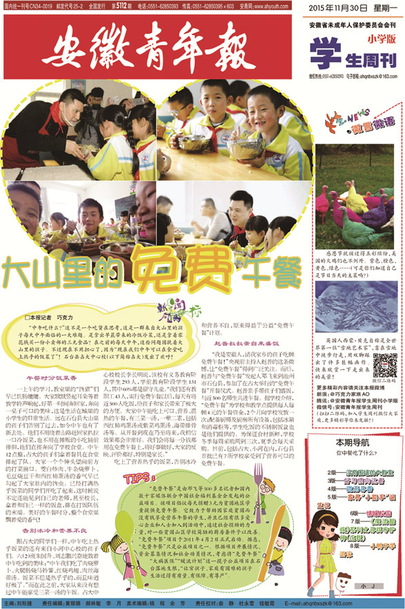 11月30日,“中午吃什么?”这不是一个吃货在思考,这是一群来自大山里的孩子每天中午面临的一大难题。“免费午餐”项目在池州市石台县开展,本报走进占大中心校,关注免费午餐项目。