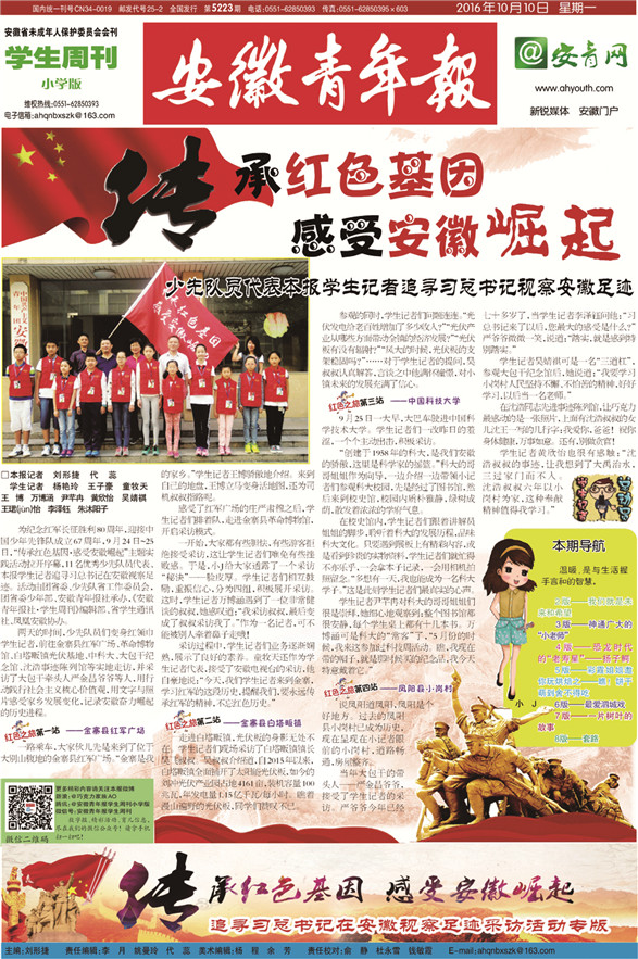 为纪念红军长征胜利80周年,迎接中国少年先锋队成立67周年,9月24日~25日,本报联合团省委、省少工委组织开展“传承红色基因·感受安徽崛起”主题实践活动。用行动记录安徽奋力崛起的历史进程。