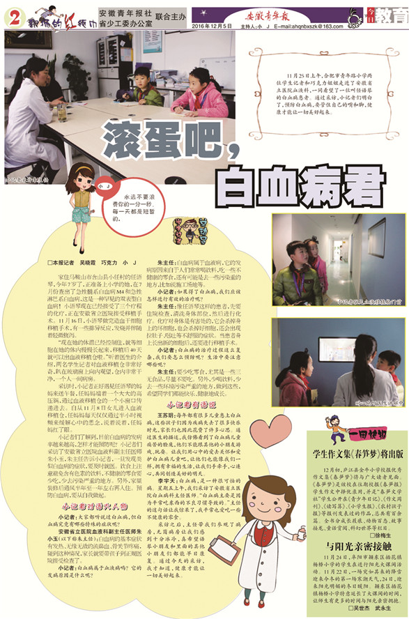 11月25日上午,学生记者代表走进了中国科学技术大学附属第一医院(原安徽省立医院)血液科,看望白血病患者,关注儿童白血病问题。