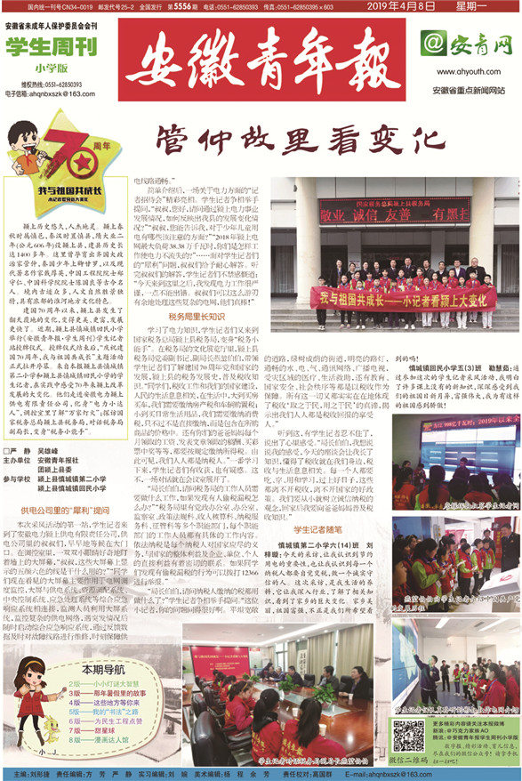 今年是新中国成立70周年。3月初,学生记者走进安徽电力颍上供电有限责任公司、探访国家税务总局颍上县税务局,正式开启年度“我与祖国共成长”主题学生记者活动。