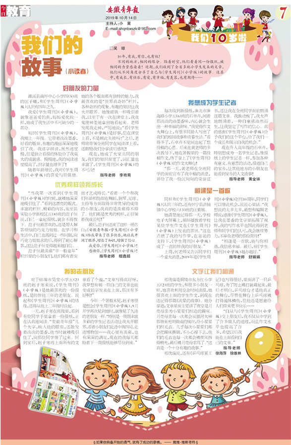 最后,范子恒还来了这样一场告白:《安徽青年报·学生周刊》(小学版)给我带来了很多快乐,她让我开阔了眼界,增长了知识,增强了信心。