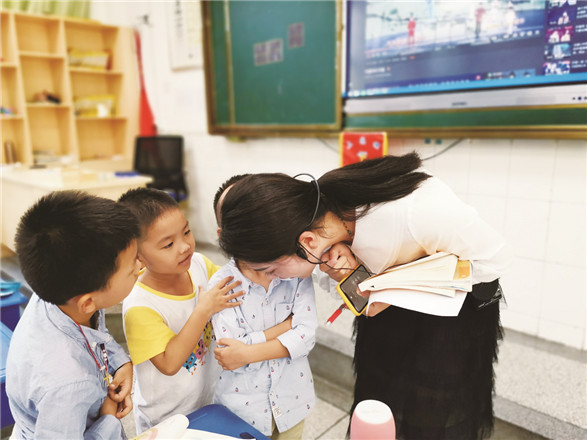 一(2)班班主任姚颖洁和一(3)班班主任洪海霞都是刚入职的“90后”老师。“我就是‘长’在班级里,一早就要进班,带领孩子早读,之后就是指导小组长收作业,然后是第一节课,下课要帮他们排好队,再带出去做早操……”谈起刚入学的场景,洪老师露出了心酸的微笑,“孩子刚上学那会儿连上课和下课都不知道,我就待在班级里,打上课铃召集他们回班级做好课前准备,打下课铃再去帮他们收拾好书包。”