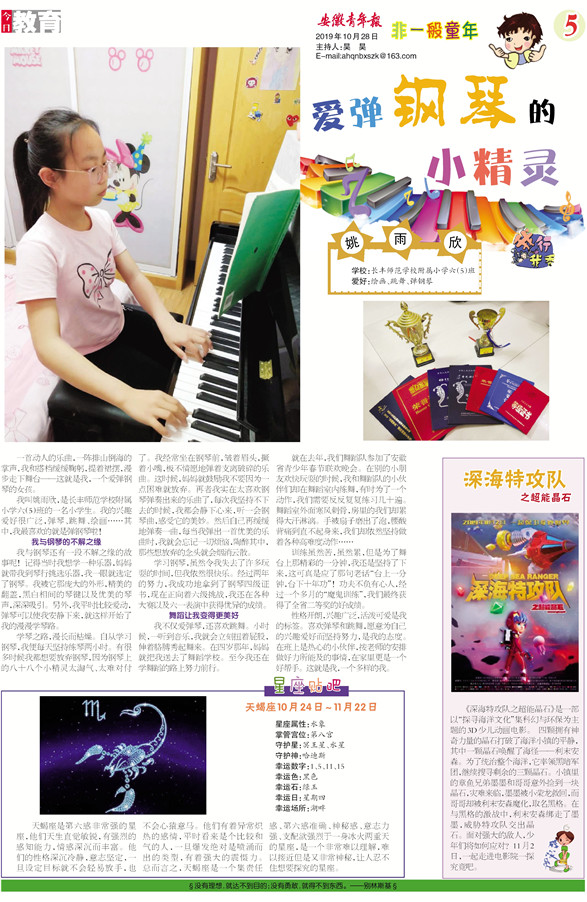 姚雨欣 学校:长丰师范学校附属小学六(5)班 爱好:绘画、跳舞、弹钢琴