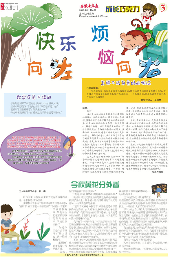 爱的教室 今秋黄花分外香 □太和县第五小学 张 梅 自古以来,中国人对重阳节就有着特殊的感情。孝亲敬老,传为佳话。 重阳节当天学校工作群里连续发送两条消息:“重阳节,祝天下老人幸福安康!”“各班加一节重阳节感恩教育课,鼓励学生把在家做好事的照片发出来,学校汇总表扬。” “知道今天是什么节日吗?”踏上讲台,我一脸神秘地问。 “重阳节!”孩子们异口同声地答道。 “是的。你们知道重阳节的习俗吗?” “登高、赏菊、佩茱萸、喝菊花酒、品菊花糕等。” 说话间,班长把教室后面的两盆金黄色的菊花搬到了讲桌上。同学们一边动情吟诵关于秋天的诗句,一边欣赏盛开的金菊。 “重阳节又被称为敬老节,孝亲敬老是中华民族的传统美德。古人云‘树欲静而风不止,子欲养而亲不待’,我们不能给自己留下遗憾。老人就是家里的福星,孝亲敬老才是为人之道。今天老师要布置一项特殊的作业。” 我环视了一下孩子们,“今天放学回家后,你们要帮助爷爷奶奶、外公外婆等长辈做一件力所能及的好事,并随机拍照留下美好瞬间,如果不在身边的也可以打个电话问候一下,但千万不能只是作秀拍照,孝敬老人要发自内心,能做到的同学请举手!”孩子们齐刷刷地举起手来。 不到12点钟,班级群里短视频、照片铺天盖地,蜂拥而来:李铭泽给白发苍苍的奶奶擦脸;陈梓萌主动帮老人清洗锅碗;李佳慧为外婆收拾房间;陶蕊妈妈则发来语音,哽咽着感谢老师们……学校工作群的提示音更是响个不停,各班都通过视频和图片撷取精彩的瞬间,一时间热闹非凡。 这下可把少先大队辅导员王晓燕主任忙坏了,采集照片,制作展板,忙得不可开交,她连续在群里发消息:请各班把照片和姓名同步报上。一呼百应,大家又忙得不亦乐乎。 下午2点左右,学校大门西侧被家长们围得水泄不通,原来是大家在围观“重阳节感恩教育课”主题活动展板,他们正急切地寻找着熟悉的身影。孩子们开心的笑脸,辉映着校园门口迎风绽放的金黄色的菊花,不约而同的赞叹声、频频的感谢声、欢快的笑声,久久地回荡在五小校园里。 我由此想到,老师们在平凡的教学岗位上所付出的辛劳不会是徒然的。今天,我们播下孝亲敬老的种子,让种子在孩子们的心田生根发芽;明天,这颗种子一定会在他们身上开花结果的。 我笔尖一动,写下当时的感受: 人生易老天难老。岁岁重阳,今又重阳,今秋黄花分外香。 孝亲敬老见行动。不似春光,胜似春光,入心见行万年长。