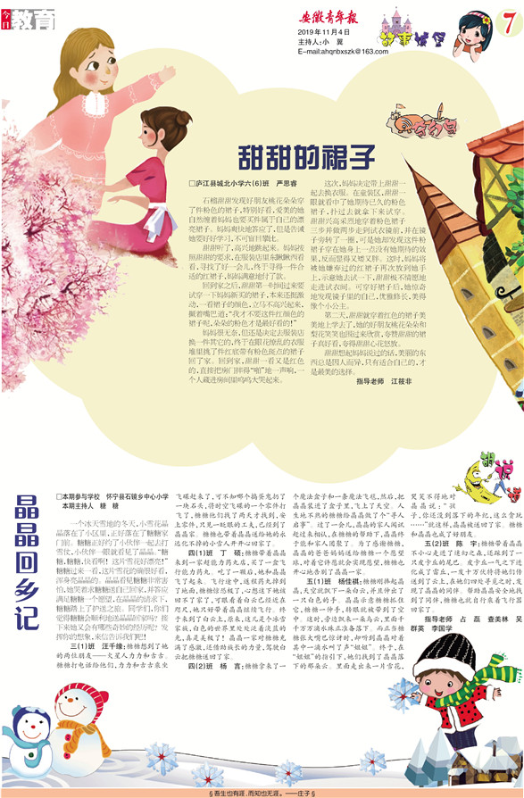 胡说八道 晶晶回乡记 □本期参与学校 怀宁县石镜乡中心小学 本期主持人 糖 糖 一个冰天雪地的冬天,小雪花晶晶落在了小区里,正好落在了糖糖家门前。糖糖正好约了小伙伴一起去打雪仗,小伙伴一眼就看见了晶晶。“糖糖,糖糖,快看啊!这片雪花好漂亮!”糖糖过来一看,这片雪花的确很好看,浑身亮晶晶的。晶晶看见糖糖非常害怕,她哭着求糖糖送自己回家,并答应满足糖糖一个愿望,在晶晶的请求下,糖糖踏上了护送之旅。同学们,你们觉得糖糖会顺利地送晶晶回家吗?接下来她又会有哪些奇妙的经历呢?发挥你的想象,来信告诉我们吧! 三(1)班 汪千缘:糖糖想到了她的两位朋友——火星人力力和古古。糖糖打电话给他们,力力和古古乘坐飞碟赶来了,可不知哪个捣蛋鬼扔了一块石头,将时空飞碟的一个零件打飞了,糖糖他们找了两天才找到,安上零件,只见一眨眼的工夫,已经到了晶晶家。糖糖也带着晶晶送给她的永远化不掉的小雪人开开心回家了。 四(1)班 丁 硕:糖糖带着晶晶来到一家超能力药丸店,买了一盒飞行能力药丸。吃了一颗后,她和晶晶飞了起来。飞行途中,返程药丸掉到了地面,糖糖惊恐极了,心想这下她该回不了家了,可眼看着白云已经近在咫尺,她只好带着晶晶继续飞行。终于来到了白云上,原来,这儿是个冰雪家族,白色的世界里处处泛着淡蓝的光,真是美极了!晶晶一家对糖糖充满了感激,还借助族长的力量,驾驶白云把糖糖送回了家。 四(2)班 杨 言:糖糖拿来了一个魔法盒子和一条魔法飞毯,然后,把晶晶装进了盒子里,飞上了天空。人生地不熟的糖糖给晶晶做了个“寻人启事”。过了一会儿,晶晶的家人闻讯赶过来相认,在糖糖的帮助下,晶晶终于能和家人团聚了。为了感谢糖糖,晶晶的爸爸妈妈送给糖糖一个愿望球,对着它许愿就会实现愿望,糖糖也开心地告别了晶晶一家。 五(1)班 杨佳祺:糖糖刚捧起晶晶,天空就飘下一朵白云,并且伸出了一只白色的手。晶晶示意糖糖抓住它,糖糖一伸手,转眼就被带到了空中。这时,旁边飘来一朵乌云,里面千千万万滴水珠正准备落下。而正当糖糖张大嘴巴惊讶时,却听到晶晶对着其中一滴水叫了声“姐姐”。终于,在“姐姐”的指引下,她们找到了晶晶落下的那朵云。里面走出来一片雪花,哭笑不得地对晶晶说:“孩子,你还没到落下的年纪,这么贪玩……”就这样,晶晶被送回了家。糖糖和晶晶也成了好朋友。 五(2)班 陈 宇:糖糖带着晶晶不小心走进了迷幻之森,还踩到了一只皮卡丘的尾巴。皮卡丘一气之下进化成了雷丘,一发十万伏特将她们传送到了云上,在她们四处寻觅之时,发现了晶晶的同伴。帮助晶晶安全地找到了同伴,糖糖也就自行乘着飞行器回家了。 指导老师 占 磊 查美林 吴群英 李国学
