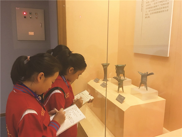 因为,总有这样的声音传来:“阿姨,能不能说慢一点呀,我还没有记完呢!”“阿姨,这个字是怎么读的啊?”原来,对六安历史极感兴趣的学生记者,想用手中的笔,记下每一段历史文明。每介绍完一个文物,也会有好奇的学生记者问:“阿姨,这个器皿上为什么会有一个洞?”“阿姨,这个熨斗古人要怎么操作呢!”“阿姨,这些铜镜是什么人都可以使用么?”知识渊博的梁阿姨解答着每个学生的疑问,还刻意放慢语速,配合大家的记录速度。所以,正常一个小时就可以完成的行程,本次愣是花了近两个小时。