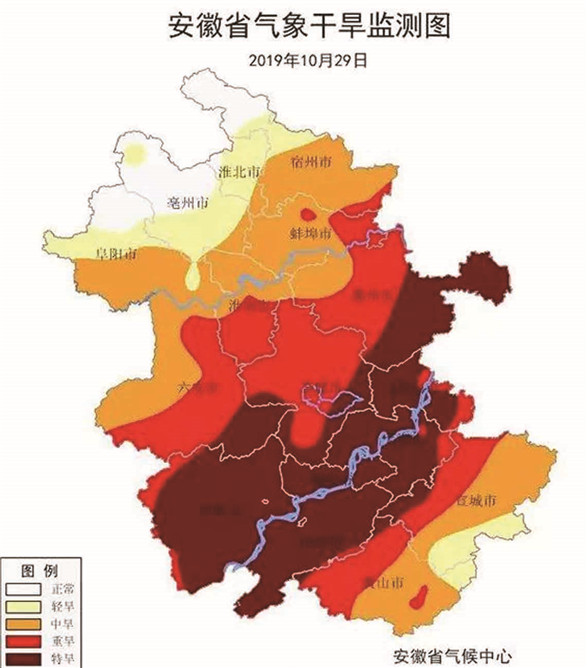 轻旱、中旱、重旱、特旱。旱旱旱!没错,数月来,安徽饱受干旱的困扰。截至10月31日,有51个市县维持“重”等以上气象干旱,其中江淮之间东部及沿江大部达特旱。据气象部门统计,8月12日至10月28日,全省平均降水量83.9mm,较常年同期偏少6成,全省平均无降水日数为65天,较常年同期偏多11天。