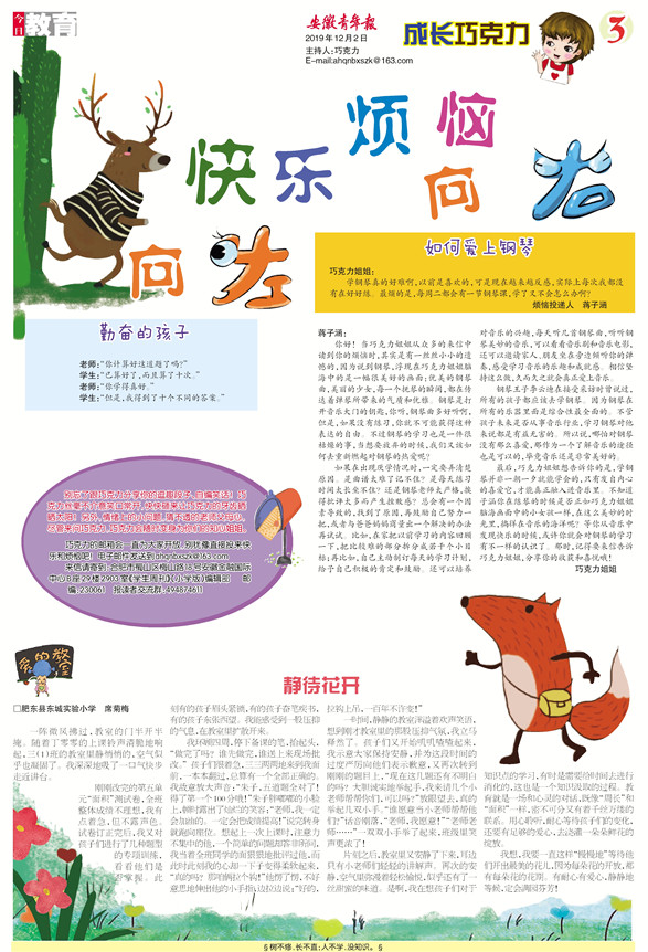爱的教室 静待花开 □肥东县东城实验小学 席菊梅 一阵微风拂过,教室的门半开半掩。随着丁零零的上课铃声清脆地响起,三(1)班的教室里静悄悄的,空气似乎也凝固了。我深深地吸了一口气快步走近讲台。 刚刚改完的第五单元“面积”测试卷,全班整体成绩不理想,我有点着急,但不露声色。试卷订正完后,我又对孩子们进行了几种题型的专项训练,看看他们是否掌握。此刻有的孩子眉头紧锁,有的孩子奋笔疾书,有的孩子东张西望。我能感受到一股压抑的气息,在教室里扩散开来。 我环顾四周,停下备课的笔,抬起头,“做完了吗?谁先做完,谁送上来现场批改。” 孩子们很着急,三三两两地来到我面前,一本本翻过,总算有一个全部正确的。我故意放大声音:“朱子,五道题全对了!得了第一个100分哦!”朱子胖嘟嘟的小脸上,顿时露出了灿烂的笑容:“老师,我一定会加油的。一定会把成绩提高!”说完转身就跑向座位。想起上一次上课时,注意力不集中的他,一个简单的问题却答非所问,我当着全班同学的面狠狠地批评过他,而此时此刻我的心却一下子变得柔软起来,“真的吗?那咱俩拉个钩!”他愣了愣,不好意思地伸出他的小手指,边拉边说:“好的,拉钩上吊,一百年不许变!” 一时间,静静的教室洋溢着欢声笑语,想到刚才教室里的那股压抑气氛,我立马释然了。孩子们又开始叽叽喳喳起来,我示意大家保持安静,并为这段时间的过度严厉向他们表示歉意,又再次转到刚刚的题目上,“现在这几题还有不明白的吗?大胆诚实地举起手,我来请几个小老师帮帮你们,可以吗?”放眼望去,真的举起几双小手。“谁愿意当小老师帮帮他们?”话音刚落,“老师,我愿意!”“老师老师……”一双双小手举了起来,班级里笑声更浓了! 片刻之后,教室里又安静了下来,耳边只有小老师们轻轻的讲解声。再次的安静,空气里弥漫着轻松愉悦,似乎还有了一丝甜蜜的味道。是啊,我在想孩子们对于知识点的学习,有时是需要给时间去进行消化的,这也是一个知识汲取的过程。教育就是一场和心灵的对话,既像“周长”和“面积”一样,密不可分又有着千丝万缕的联系。用心聆听,耐心等待孩子们的变化,还要有足够的爱心,去浇灌一朵朵鲜花的绽放。 我想,我要一直这样“慢慢地”等待他们开出最美的花儿,因为每朵花的开放,都有每朵花的花期。有耐心有爱心,静静地等候,定会满园芬芳!