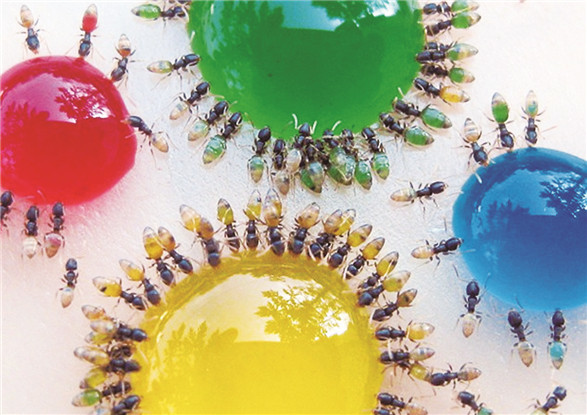 巴度博士还发现,这些蚂蚁偏爱浅色的食物,绿色和黄色的糖滴周围总会围满蚂蚁,而深绿色和蓝色的糖滴则无蚁问津。现在有许多人喜欢养昆虫作为宠物,看了这个发现之后,不知大家是否会想养一群“彩虹蚂蚁”? 来源:果壳网