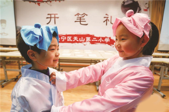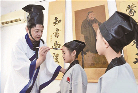 据《礼记》记载:“礼义之始,在于正容体,齐颜色,顺辞令。”因此,古代开学仪式的第一课即是“正衣冠”。古人认为:“先正衣冠,后明事理。”让学生注重自己的仪容整洁,是首先要上的第一课。入学时,新生要一一站立,由先生依次帮学生整理好衣冠。然后,“衣冠整齐”地排着队到学堂前集合。恭立片刻后,才能在先生的带领下进入学堂。要让学生爱自己,尊重自己,衣着整洁能体现出一个人的品格与典范。