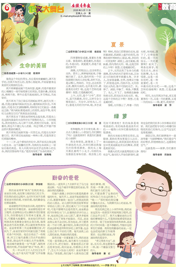 爸爸曾经开玩笑地告诉我,他经常与这个城市的早晨见面。爸爸曾经是位IT工程师,在省移动公司从事软件项目管理工作,你别看他的工作简单又重复,其实,可藏着大能量呢。爸爸他们研发的网络系统支撑着全省的业务办理,每周都会进行系统更新,所以就经常熬夜加班。爸爸常常第二天迎着朝霞回家,时间久了,爸爸回家的时间就包括了夜晚的各个时间段。他还总结出了一些规律,环卫工每天凌晨三四点开始清扫路面,路边的早点铺五点开始摆摊。他说城市就像是一台“机器”,每到夜晚的时候,开始逐渐“熄火”休息,第二天一早从环卫工人打扫卫生开始,这个庞大的“机器”又开始慢慢滚动,一直到早上7点钟开足了马力全速运转。与这个城市早晨见面的爸爸,传递给我的是勤奋。
