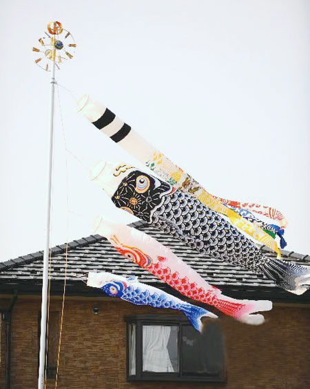 然也会在室内摆设各种娃娃,但它们看上去就像日本古代的武士一样,十分英武。同时,家长们还会在室外挂鲤鱼旗和七色彩旗纸做的黑鲤鱼和红鲤鱼。