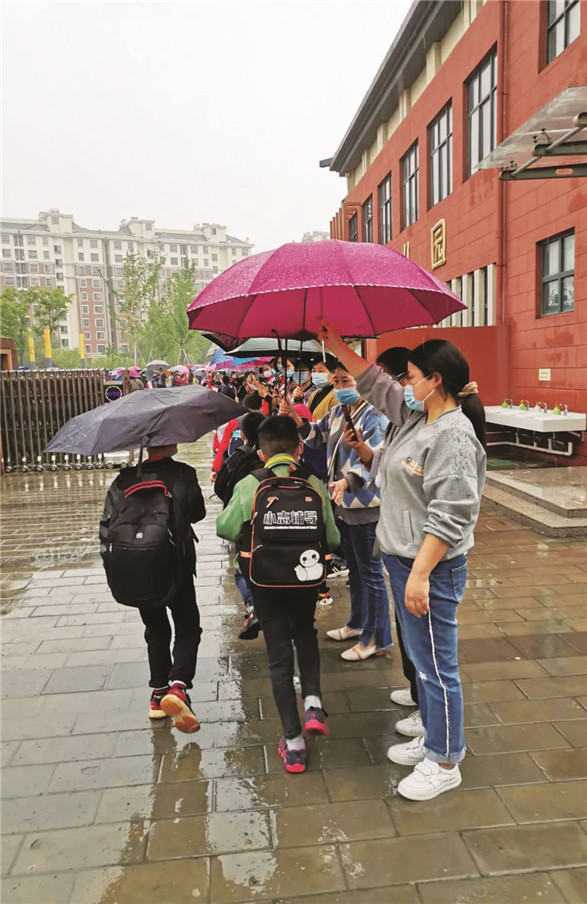 5月8日,在泗县明德小学校门口出现了一道亮丽的风景线。由于中午放学时,滂沱大雨突然而至,为解决疫情期间家长不方便入校园的问题,在校长姚瑞达的带领下,老师们拿起雨伞站在雨中,排起长长的队伍,用爱心为孩子们撑起了一片晴空。看到大爱无私的老师们这暖心一幕,家长们纷纷竖起了大拇指!淅淅沥沥的雨中,见证的是浓浓伞下情,满满都是爱。
