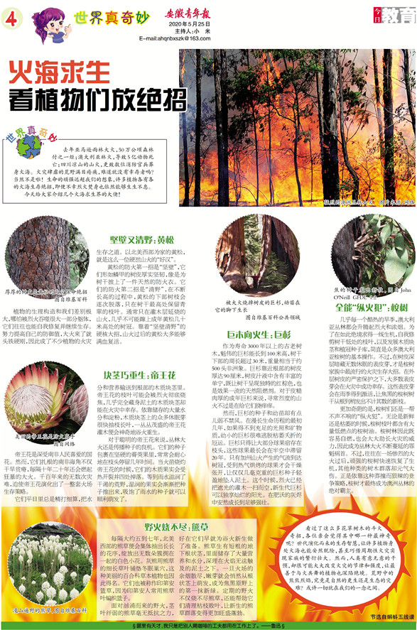 去年亚马逊雨林大火,50万公顷森林付之一炬;澳大利亚林火,导致5亿动物死亡;四川凉山的山火,更致数位消防官兵葬身火海。火灾肆虐的荒野满目疮痍,难道就没有幸存者吗?当然不是啦!生命的顽强远超我们的想象,许多植物各有各的火海生存绝招,即便不幸烈火焚身也依然能够生生不息。