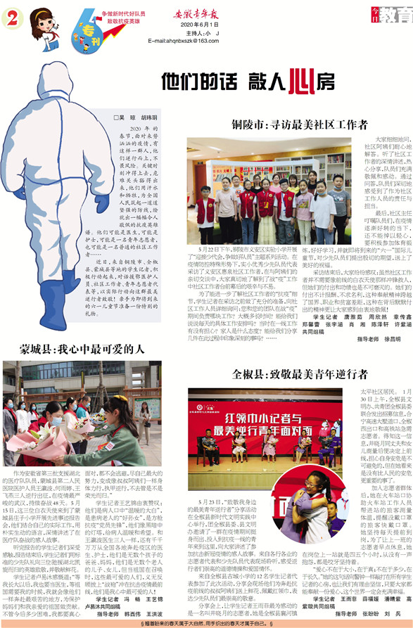 近日,来自铜陵市、全椒县、蒙城县等地的学生记者,积极行动起来,对话援鄂医护人员、社区工作者、青年志愿者代表等,以实际行动向这群最美逆行者致敬!亲手为即将到来的六一儿童节准备一份特别的礼物。
