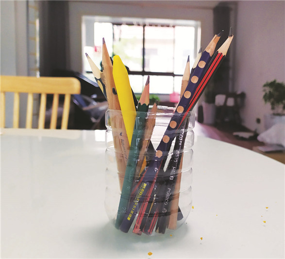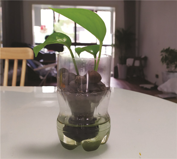 池州市贵池区城西小学四(9)班的陈张祯祥同学就有超强的动手能力,他利用家里的废旧瓶子进行循环利用,制作出各种有趣又实用的小物品,并详细介绍了自己的作品:“我用旧瓶子制作过很多的手工作品,有肥皂盒、沥水篮、储物瓶、笔筒、花瓶、漏斗等。其中花瓶的制作是最令我满意的,做起来也简单,将瓶子沿着瓶底三分之一处切开,在瓶盖戳几个洞,再将瓶子的上半部分倒放在瓶底,瓶身装上陶土,插入水培植物,比如绿萝,这样一个花盆就做好了,植物能吸收瓶底的水。我已经养了这盆绿萝足有三个月,还是很精神。”