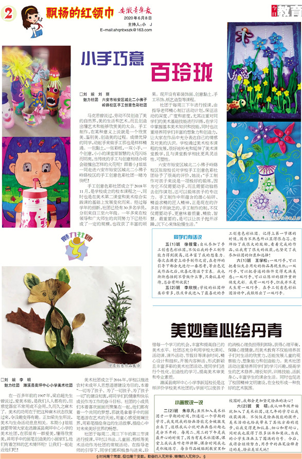 六(1)班 王学松:一双巧手,可以把看似失去用处的物品再现生机;一双巧手,可以把普通的物件变得充满美感;一双巧手,可以让陈旧的摆件重新焕发光彩。我有一双巧手,但我并不是天生有一双巧手。在手工创意色彩社团活动中,我锻炼出了一双巧手。