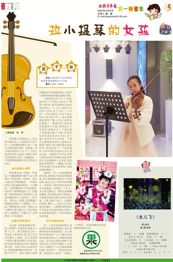 有一个爱好是很难得的,爱好得到发展是更难得的,我非常感谢妈妈支持我的爱好。在小提琴方面我获得了3、5、7级证书并参加安徽电视台少儿春晚的录制机会。在主持方面我也得到了更多的机会,在更大的舞台上主持节目,也参加了几次区级讲故事比赛,均获得了一等奖的好成绩。我相信古人说的“一分耕耘,一分收获”。我将带着这份坚持,继续向梦想出发!