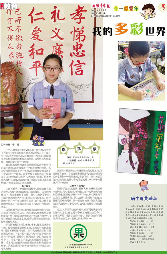 幼儿园的时候我就喜欢涂涂画画,最开始学习的是卡通画,这为我打开一个色彩斑斓的世界。真正学习画画是在小学一年级,这让我离梦想又近了一步:成为一个画家。这个梦想早就在我心中生根发芽,在老师的悉心教导下,我的笔下画出了很多卡通人物和小动物,奔跑的小鹿、绿色的草地以及袅袅炊烟,一切都是那么的生机勃勃。