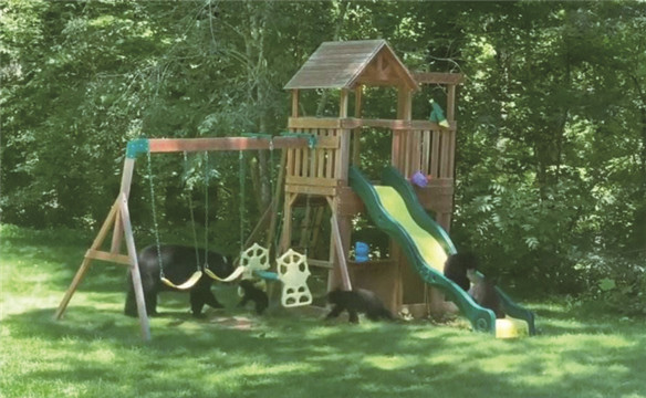 美国北卡罗来纳州阿什维尔市一户人家近期拍到一群小熊在后院滑梯和秋千上嬉戏的场景,一头母熊在一旁“望风”,画面令人忍俊不禁。滑梯上最多时有三头小熊一个挨一个从滑道末端爬上去,再一块儿滑下来。真是熊孩子!