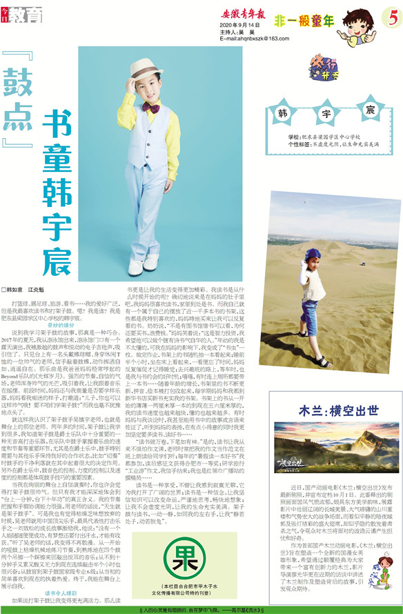 “读书破万卷,下笔如有神。”是的,读书让我从来不惧怕作文课,老师时常把我的作文当作范文在班上朗读给同学们听;每年的“暑假读一本好书”我都参加,读后感征文获得合肥市一等奖;研学旅行“工业游”作文,我信手拈来;我也是红领巾广播站的撰稿员……