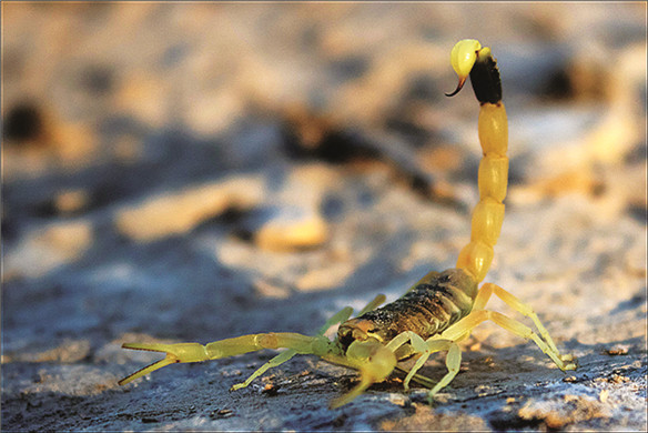 有趣的是,越是巨大威猛的蝎子种类,尾针中的毒液往往越是威力平平,看似弱小的巴勒斯坦毒蝎却是蝎中“毒王”。它们的毒液含有混合型的神经毒素,小鼠皮下注射的LD50约为0.16毫克/千克,一次凶狠的蜇咬便能致人死地。又名以色列金蝎的它们,是横行中东北非的“死亡潜行者”,被公认为世界最危险的蝎子种类之一。