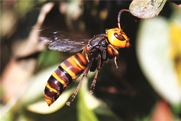 又名金环胡蜂的大虎头蜂,身长可以达到5厘米上下,是中国也是世界体型最大的胡蜂种类。它们是典型的社会性昆虫,常常在地面或树洞筑巢集体生活。连接着体内毒腺的锋利蜇针,是大虎头蜂制服猎物和守护蜂巢的神兵利器。