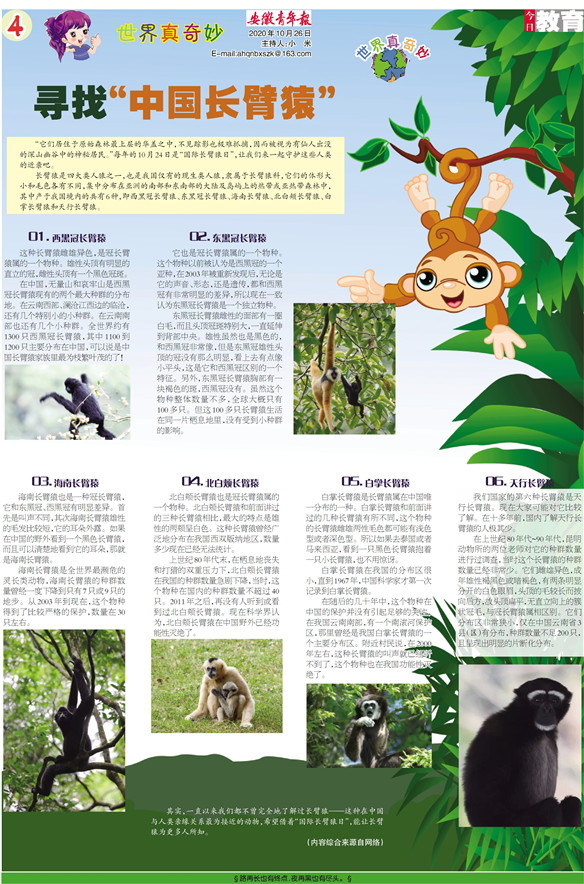 长臂猿是四大类人猿之一,也是我国仅有的现生类人猿,隶属于长臂猿科,它们的体形大小和毛色各有不同,集中分布在亚洲的南部和东南部的大陆及岛屿上的热带或亚热带森林中,其中产于我国境内的共有6种,即西黑冠长臂猿、东黑冠长臂猿、海南长臂猿、北白颊长臂猿、白掌长臂猿和天行长臂猿。
