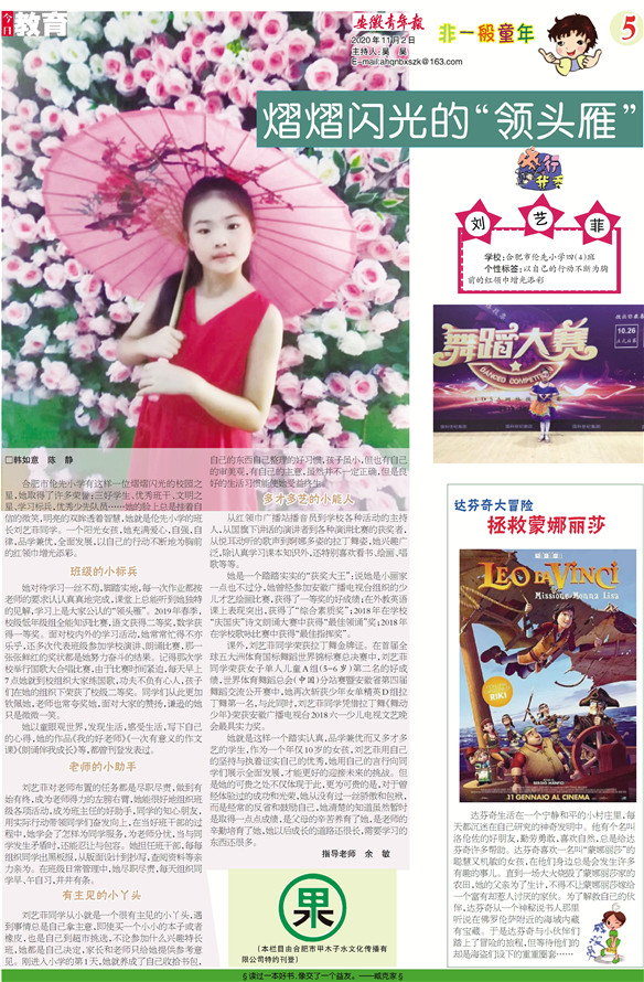 合肥市伦先小学有这样一位熠熠闪光的校园之星,她取得了许多荣誉:三好学生、优秀班干、文明之星、学习标兵,优秀少先队员……她的脸上总是挂着自信的微笑,明亮的双眸透着智慧,她就是伦先小学的班长刘艺菲同学。一个阳光女孩,她充满爱心,自强,自律,品学兼优,全面发展,以自己的行动不断地为胸前的红领巾增光添彩。