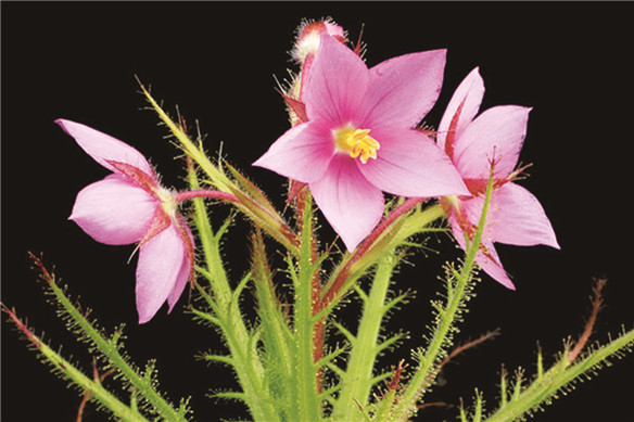 生长于土地贫瘠的南非高原,美杜莎捕虫树演化出了满身细密的长毛,上面点缀着不计其数的黏稠树脂小球。正如戈尔贡三姐妹用蛇发缠住不幸的路人,捕虫树的黏液陷阱能够捕获路过的每一只飞虫。美杜莎捕虫树自己并不能消化猎物,与它共生的刺蝽会享用这些美食,然后再用排泄物供养自己的植物房东。