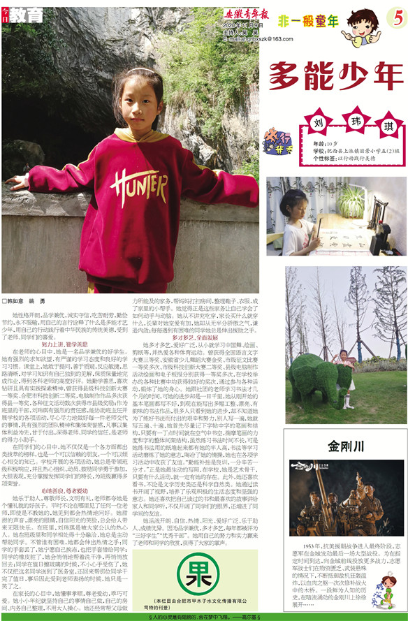 她多才多艺,爱好广泛,从小就学习中国舞、绘画、剪纸等,并热爱各种体育运动。曾获得全国语言文字大赛三等奖、安徽省少儿舞蹈大赛金奖、市级征文比赛一等奖多次、市级科技创新大赛二等奖、县级电脑制作活动绘画和电子板报分别获得一等奖多次,在学校举办的各种比赛中均获得较好的奖次,通过参与各种活动,锻炼了她的身心。她跟社团的老师学习书法才几个月的时间,可她的进步却是一日千里,她从刚开始的基本笔画都写不好,到现在能写出多幅工整、漂亮、有韵味的书法作品,很多人只看到她的进步,却不知道她为了练好书法而付出的艰辛和努力,别人写一遍,她就写五遍、十遍,她首先尽量记下字帖中字的笔画和结构,只要有一丁点时间就在空气中书空,揣摩笔画的力度和字的整体间架结构,虽然练习书法时间不长,可是她练书法用的纸堆起来都有她的半人高,书法等学习活动磨练了她的意志,陶冶了她的情操,她也在各项学习活动中收获了友谊。“勤能补拙是良训,一分辛苦一分才。”正是她最生动的写照,在学校,她是艺术骨干,只要有什么活动,就一定有她的存在。此外,她还喜欢看书,不论是文学历史类还是科学自然类。她通过读书开阔了视野,培养了乐观积极的生活态度和坚强的意志。她还喜欢把自己读过的书和最喜欢的故事讲给家人和同学听,不仅开阔了同学们的眼界,还增进了同学间的友谊。
