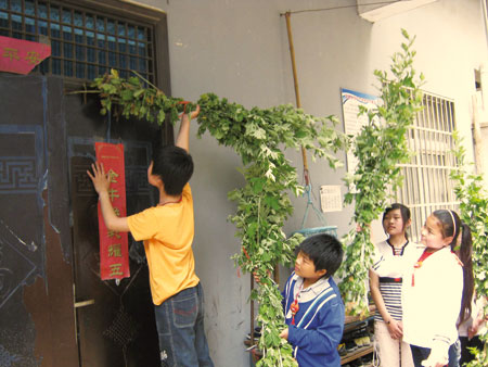 作为端午节的首项活动,我们的学生记者和留守伙伴们一起,把学生公寓打扫得干干净净。你瞧,韦栋梁多认真,他要踩在凳子上,踮起脚尖,才能够着门楣(méi),不过,这一点也难不倒能干的他。
