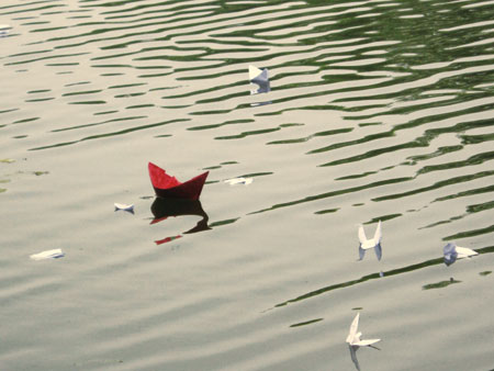 赛龙舟是端午的传统习俗,对于同学们来说,驾驭(yù)龙舟显然有些难度。不过,聪明的他们想出另外一个活动“替代”——放纸船。