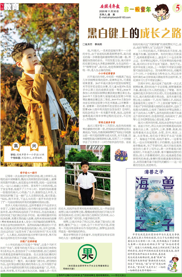 小小年纪的高兴,不管妈妈在不在家,他都毫不松懈,坚持练琴。有的时候白天耽误了,他再晚都要补练上,就连年三十也没有停止过。在学琴的过程中,不仅有琴技的稳步提高,高兴的认字水平也突飞猛进。依托于此,他早早地爱上阅读,上一年级时不用家长读题便可独自完成作业。因为练琴时间长,动辄两三个小时,十分锻炼定力和专注力,所以在学校听课的40分钟里高兴都能很专注地听课,文化课学习几乎不用家长操心。