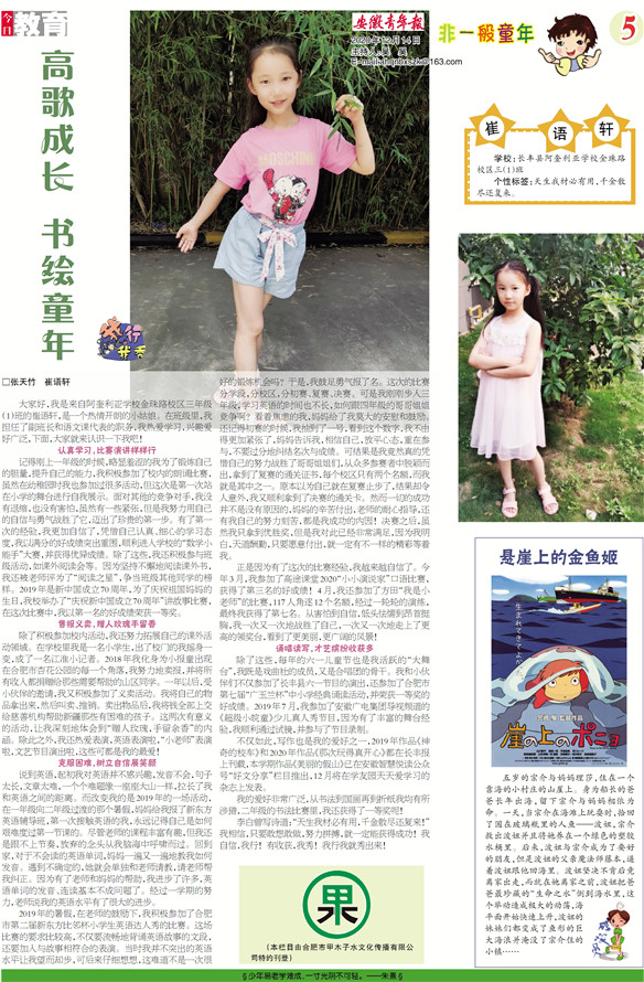 除了这些,每年的六一儿童节也是我活跃的“大舞台”,我既是戏曲社的成员,又是合唱团的骨干。我和小伙伴们不仅参加了长丰县六一节目的演出,还参加了合肥市第七届“广玉兰杯”中小学经典诵读活动,并荣获一等奖的好成绩。2019年7月,我参加了安徽广电集团导视频道的《超级小皖童》少儿真人秀节目,因为有了丰富的舞台经验,我顺利通过试镜,并参与了节目录制。