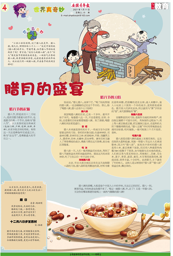 “小孩小孩你别馋,过了腊八就是年。腊八粥,喝几天,哩哩啦啦二十三……”这是中国传统《腊八歌》的开头。哼着哼着,似乎腊八节的味道渐浓了呢!常言道:“送信儿的腊八粥”,这个“信儿”便是春节将要到来的消息。一碗香气扑鼻的腊八粥,既有温暖的亲情,也浸透着浓浓的年味儿。就让我们用一碗腊八粥,开启春节的热闹吉祥吧!