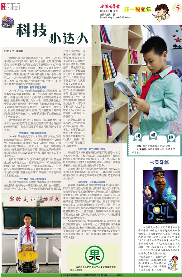 这个作品最终获得2020年安徽省青少年科技创新大赛一等奖。他除了喜欢探索研究科学问题,还经常参加各类科技活动,比如:航模大赛、“小牛顿”科技社团等,成绩斐然。