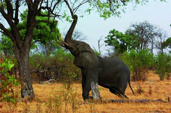 非洲草原象是名副其实的“大胃王”,每天要吃掉约150公斤植物。它们的象鼻能够拉扯枝条,撸下树叶,扒掉树皮,拔起树根,当然也能从地上捡起圆滚滚的水果。如果食物位置太高够不着,草原象还能用粗壮的鼻子卷住树干,配合象牙和身体将树推倒,然后再细嚼慢咽胜利的果实。饮水时,肩高近4米的非洲草原象也不会低下“高冷”的头,它会用象鼻汲水送入口中。哪怕湖沼濒临干涸,它们也能用鼻子在泥滩上刨出浅坑,收集洁净的水。