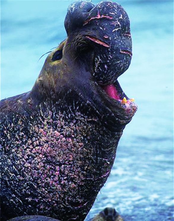 北方象海豹是栖息在东北太平洋海域的巨兽。它们主要在加拿大、美国和墨西哥西海岸的偏僻岛屿上繁殖和育幼。这种海豹表现出显著的“性二型”,也就是雄性和雌性的外貌差别很大。成年雄性象海豹的体长可达5米,体重近3吨,脸上还长着30厘米的臃肿大鼻子。雌性的体型则较小,体长不足3米,体重不足1吨,而且鼻子很小,貌不惊人。从这个角度上看,长鼻子是雄性象海豹的第二性征。只不过,这个大鼻子也不是与生俱来的。大概3岁左右雄性的鼻子才会开始发育长大。
