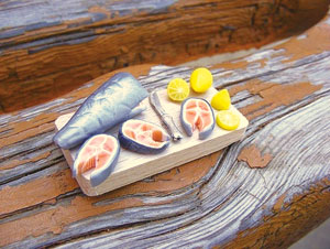 接下来要轮到大鱼大肉上场啦!别不相信哦,制作两条新鲜三文鱼,只要灰白两种颜色的材料就可以做到。