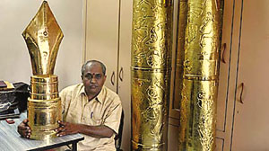 钢笔?没错!这位印度大叔捧着的是一尊比大力神杯还要大的笔头,而且这仅仅是笔头,整支笔的情况是这样的:长4.87 米,重40公斤。至于它有多粗,看看大叔的手就知道了,一只手是肯定握不了的!