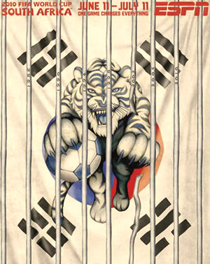 对于被称为“太极虎”的韩国队,海报进行了一些很有趣的处理,在韩国国旗的太极图案前描画了一头猛虎。乍一看,这头猛虎似乎被禁锢在牢笼之中,可仔细看来,却发现它已经折断了一根栏杆,象征着韩国队有望在这个小组突出重围。