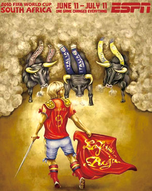 在西班牙队的海报中,出现了传统的斗牛士形象,9号托雷斯手持利剑面对来自各方的“公牛”。如果对这些“公牛”身上绶带的颜色进行分析,会发现那可能分别代表了英格兰队、意大利队还有巴西队这些夺冠道路上的劲敌。