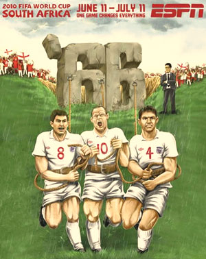 鲁尼、兰帕德还有杰拉德,这些著名球星在海报中扮演起了“纤夫”,主教练卡佩罗则隐藏在他们身后进行指挥。至于被他们拖曳(yè)的对象,则是写有“66”字样的巨碑,可见英格兰队的目标很明确,那就是重现在1966年夺得世界杯冠军的那一幕。