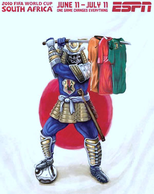 日本队在海报中的形象多少显得有点恐怖,在太阳旗的背景之下,一位全副武装的日本武士手持利刃。细看之下,还会发现武士刀已经刺穿了荷兰队、丹麦队和喀麦隆队这三个小组对手的球衣,整幅画面给人以一种咄(duō)咄逼人的感觉。